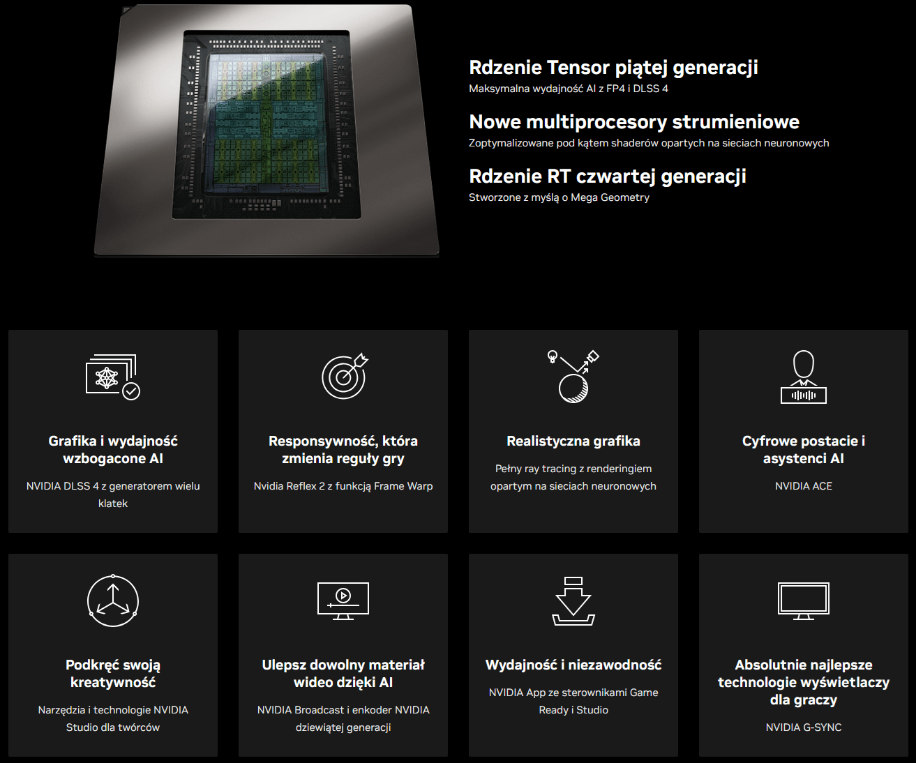 - 4 rdzenie Tensor 5. generacji z obsługą FP4 (32x wydajność vs pierwsza generacja)